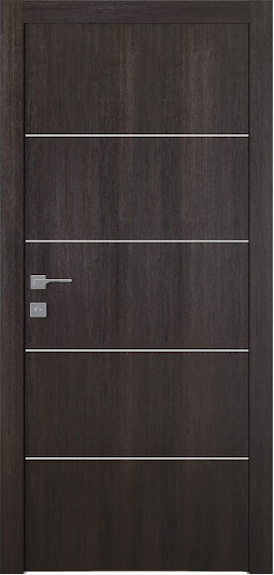 Shiny aluminum strips create a wonderful visual effect. Reflections of light give the door design a unique individuality. Optima 4H Veralinga Oak is decorated with 4 strips that form 5 identical panels and bring spectacular modern style.